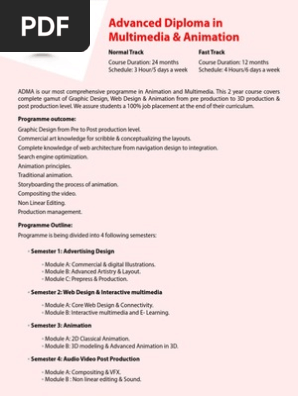 Advanced diploma in 3d animation vfx and multimedia. The unique structure of this program bring simple characters to life learn how acting and directing can influence animation. Advanced diploma in multimedia animation is diploma level multimedia animation and gaming course. The course provides overall knowledge on 2d classical digital 3d animation visual effects. Overview this unique diploma in vfx 3d is 360 degree industry relevant program which equips the learner through both the field of 3d and vfx and gives further opportunity for 2 months of internship.